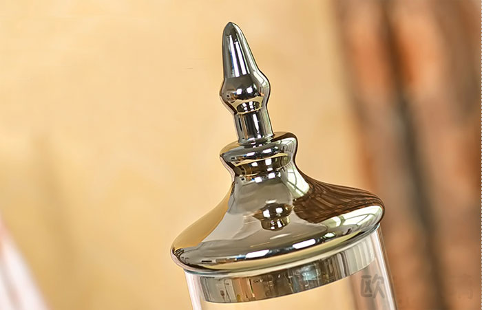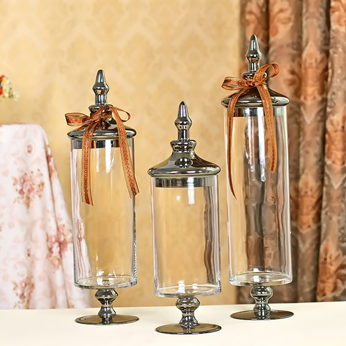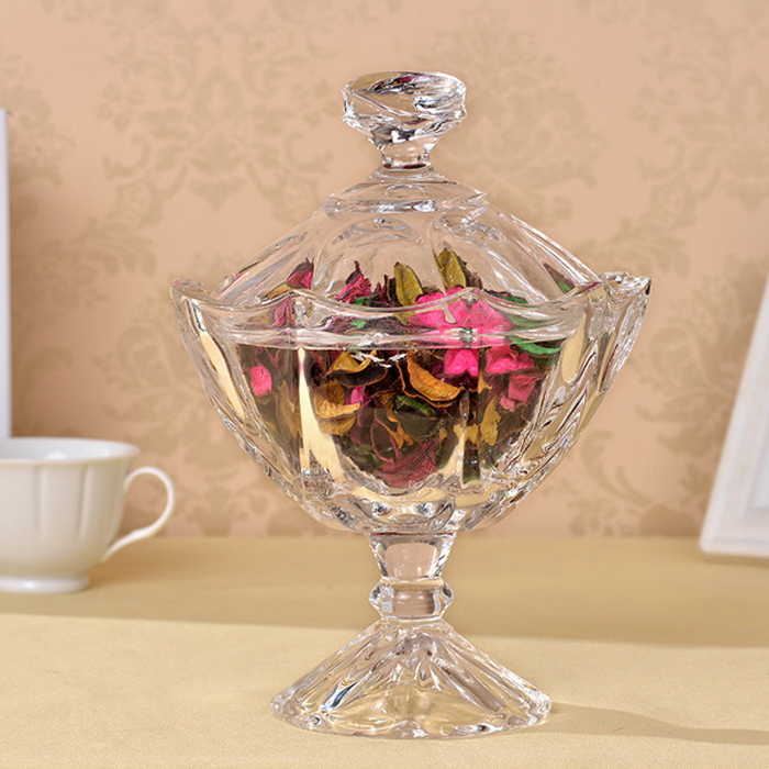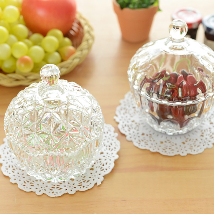 Chai lọ thủy tinh thấp có nắp đậy như chiếc vương miện sang trọng, sắc sảo, kích thước 6.5 x 12.5 cm, đường kính miệng thố 10.5 cm, giá thành khoảng 60.000 đồng/ chiếc.