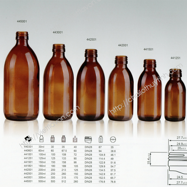 Dung tích: 30ml; 60ml; 100ml; 125ml; 150ml; 180ml; 200ml; 250ml; 300ml; 500ml