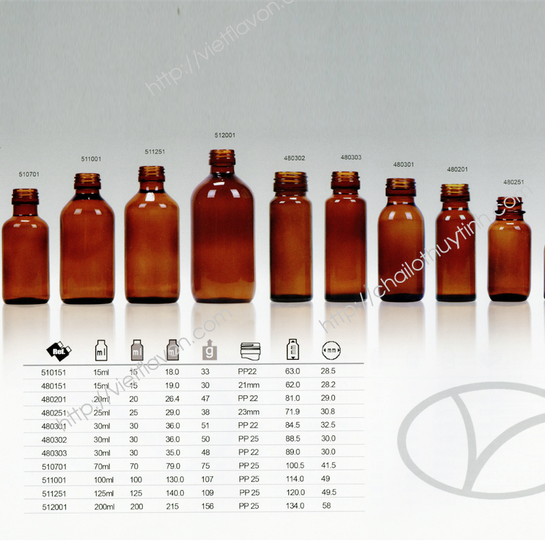 Dung tích: 15ml   ;20ml   ;25ml; 30ml;70ml;100ml; 125ml