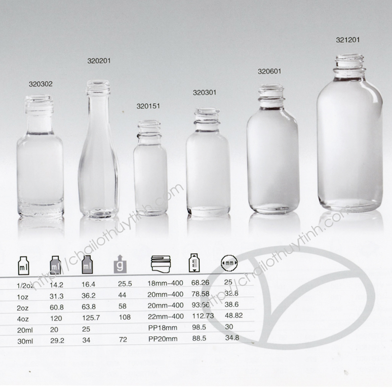 Dung tích: 1/2oz; 1oz; 2oz; 4oz; 20ml; 30ml